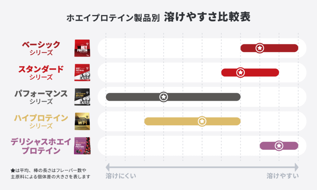 以下、誤差も含めたホエイプロテイン製品の溶けやすさ(ダマ量)の基準をまとめておりますので、参考にして製品をお選びいただきますと幸いです。